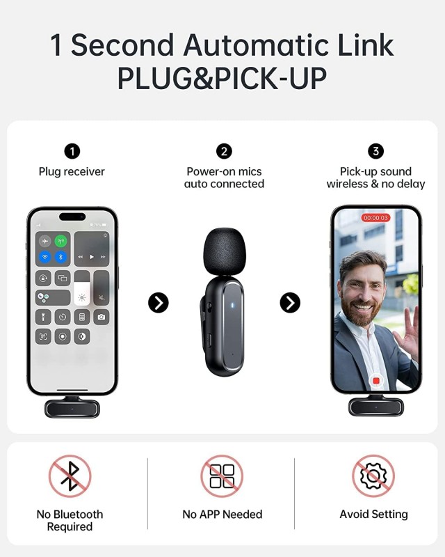 🔹 Plug & Play… لا يحتاج بلوتوث أو تطبيقات. فقط وصّل المستقبل بمنفذ Lightning وابدأ التسجيل فورًا.