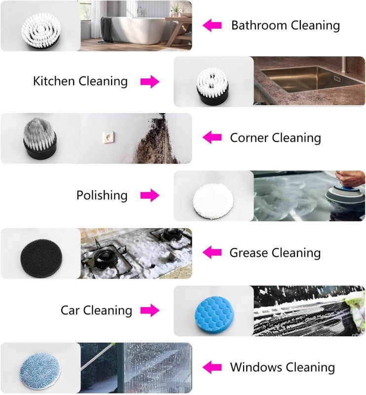 تنظيف البلاط، الحمام، المطبخ، الأحواض، الأثاث، الزوايا الضيقة، والأسطح الحساسة.